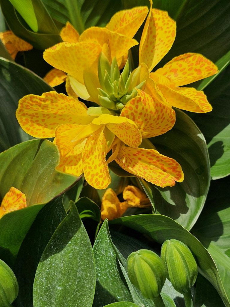 Canna lilies bring tropical scale, with broad leaves and bold flowers that read like fireworks in a mixed bed. In warm weather the clumps bulk up quickly, and the foliage can make smaller flowers feel secondary.