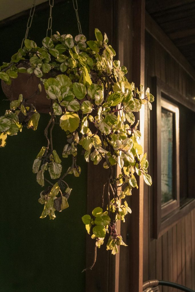 Pothos trails gracefully from shelves and high cabinets, turning a dim corner into something softer without asking for bright daylight. In low light it often shifts toward solid green and stretches more slowly, but it keeps leaves better than most vines.